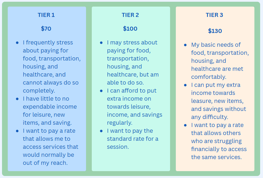 I trust my clients to pick the payment tier that feels accessible and accurate for them at the time of booking; I do not ask for financial information.